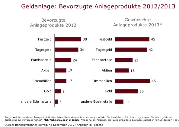 Festgeld und Tagesgeld waren 2012 die bevorzugten Anlageprodukte der Deutschen. Das geht aus der Umfrage „Geldanlage 2012/2013“ im Auftrag des Bankenverbandes durch die GfK Marktforschung hervor. Dafür wurden 950 wahlberechtigte Deutsche befragt. 38 Prozent der Befragten gaben an, dass sie Festgeld bevorzugen. 34 Prozent sprachen sich für Tagesgeld aus. Mehrfachnennungen waren dabei möglich.