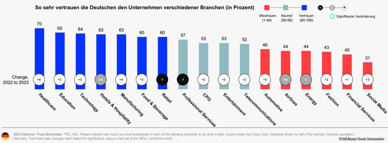 Gespalten ist die Republik in Bezug auf die Beurteilung von Unternehmen aus den Sektoren Sachversicherung (53 %) und Personenversicherung (51 %). Zwar traut auch nur jeder zweite Befragte den Banken (54 %). Doch die Branche hat in Deutschland im Vergleich zum Vorjahr eine erstaunliche Entwicklung hingelegt: Der Trust Score für Banken nahm um 16 Prozentpunkte zu. Der Bankensektor hat also von 2022 auf 2023 in Deutschland deutlich an Vertrauen gewonnen. Diese Entwicklung koppelt sich vom Rest der global befragten Länder ab, wo Banken durchschnittlich nur zwei Prozentpunkte gewinnen konnten. Ein Wermutstropfen bleibt: Mit 63 Prozent sprechen die global Befragten dem Bankensektor jeweils in ihrem Land immer noch ein höheres Vertrauen aus als die Befragten in Deutschland. Auf die Frage „Dienen die Finanzdienstleistungsunternehmen den Interessen aller gleichermaßen und gerecht?“ haben nur 27 Prozent der Deutschen mit Ja geantwortet.