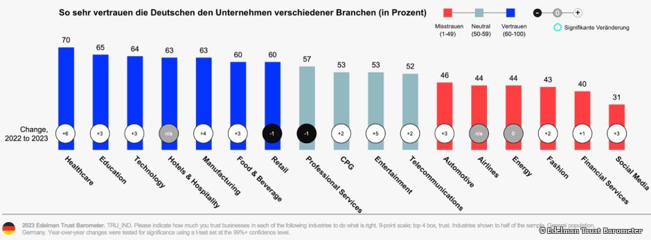 Es steht nicht gut um das Vertrauen der Anleger in die deutsche Finanzbranche. Glaubt man den Umfrageergebnissen des aktuellen Edelman Trust Barometer – Insights for Financial Services, vertrauen nur 40 Prozent der Befragten hierzulande Unternehmen aus dem Financial-Service-Sektor. Das ist ein beeindruckendes Misstrauensvotum im Vergleich zum globalen Durchschnitt von 59 Prozent. Was nicht heißt, dass die Finanzindustrie international nicht auch kritisch gesehen wird. Von 17 ausgewählten Branchen schenken Kunden weltweit Unternehmen aus dem Finanzsektor am zweitwenigsten Vertrauen – nur Unternehmen aus dem Social-Media-Sektor wird noch weniger vertraut.