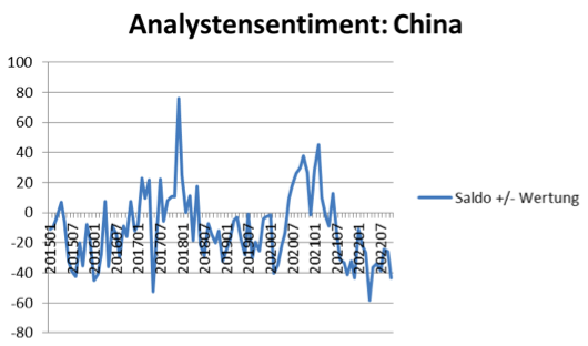 Relativ besser, wenngleich nicht gut, ist das Sentiment der Finanzexperten, wenn es um die USA geht. Auch hier war ein politisches Großereignis in den letzten Wochen ein wichtiger Faktor, die Midterm-Wahlen. Für die Märkte scheint indes die Geldpolitik fast noch wichtiger als die Frage, ob die Republikaner gegenüber den Demokraten wieder an Boden gewinnen. Insgesamt verschlechterte sich das Sentiment in den Aussagen mit US-Bezug von -13,8 auf -20,2. Ein wichtiger Faktor in den negativen Einschätzungen sind prominente Einzeltitel wie Amazon oder Meta. Bei Amazon dürfte es dabei um eine Normalisierung nach dem stürmischen Wachstum der Corona-Jahre gehen. Bei Meta fehlt den zitierten Finanzexperten weiterhin eine klare Begeisterung für das große Zukunftsprojekt „Metaversum“ und die damit verbundenen Ausgaben. Die vorläufigen Auswertungen der Sentiment-Daten für November mit US-Bezug zeigen indes deutlich nach oben. Zumindest punktuell sehen die Finanzexperten offenbar schon wieder Einstiegsmöglichkeiten. Ob sich dieser Trend noch verstärkt, dürfte wesentlich von der „Weihnachtskauflaune“ der US-Verbraucher abhängen, die im Finanzmarkt als Stimmungsindikator für die Konjunktur gilt.