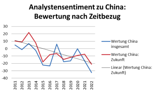 Die jüngsten Meldungen über gewalttätige Auseinandersetzungen zwischen der Polizei und Arbeitern in einer großen chinesischen Foxconn-Fabrik aufgrund von Anti-Corona-Maßnahmen und die landesweiten Demonstrationen am Wochenenden scheinen wie eine Bestätigung dieser Befürchtungen. Schaut man, was die Finanzexperten als Negativ-Faktoren im Oktober anführen, dann gibt es realwirtschaftliche Gründe wie die schwachen Immobilienmärkte, die Politik wird aber recht unverblümt ebenfalls als Hemmschuh benannt. Auch die Einschätzungen zur konjunkturellen Entwicklung sind ein klarer Negativ-Posten in den Aussagen. Was bedeutet das für Investoren? Trotz der über das letzte Jahr stark gefallenen Aktienkurse (Ende Oktober notierte der CSI bei 3.495 Punkten) scheinen dieFinanzexperten noch zurückhaltend mit Erwartungen einer nahen und deutlichen Kurserholung. Interessant ist dabei auch ein Thema, welches gar nicht im Zentrum vieler Zitate steht: Wenn es um Forschung und Entwicklung geht, ist die Einschätzung in den ausgewerteten Analystenzitaten ebenfalls zuletzt negativ. Insgesamt scheint China also ein Vertrauensproblem an den Märkten erworben zu haben. Das wird besonders deutlich, wenn man sich die Langzeitentwicklung anschaut und hier vor allem die Einschätzungen zur Zukunft. Vom optimistischen Narrativ „Wachstumsmarkt China“ zwischen 2011 und 2014 ist nichts geblieben. Zwar gab es im Hinblick auf die Rolle Chinas („Konjunkturlokomotive“) in der Covid-Zeit noch einmal eine leichte Verbesserung im Sentiment, aber insgesamt ist der Optimismus der Finanzexperten einer großen Skepsis gewichen. Insofern stellt sich für Investoren die Frage, welche Relevanz historische Kursniveaus dann überhaupt haben. Zu dem skeptischen Narrativ passen anekdotisch Berichte wie aus der Wirtschaftswoche vom 25.11.2022, dass reiche (Unternehmer-) Chinesen zunehmend ihre Vermögen und Aktivitäten in Regionen außerhalb Chinas verlagern.