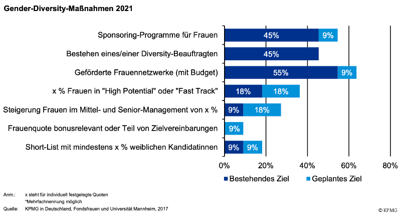 Wie in vielen anderen europäischen Ländern auch, gibt es in Deutschland mittlerweile für Unternehmen ab einer bestimmten Größe eine gesetzliche Frauenquote. Von denjenigen Unternehmen, die der gesetzlichen nicht unterliegen, gaben nur 27 Prozent an, sich freiwillig eine Quote vorzugeben. Feste Zielgrößen für den Vorstand und die Geschäftsführung gibt es nur bei 36 Prozent dieser Unternehmen. Angesichts der geringen Anzahl von Bewerberinnen haben die Unternehmen jedoch eher das offensichtliche Problem, Frauen überhaupt für eine Karriere in ihrer Branche zu begeistern. Deshalb forcieren Asset Manager sogenannte „Soft Policies“ jenseits der Quoten. Zu solchen Maßnahmen gehören Sponsoring-Programme für Frauen, die Förderung von Frauennetzwerken und die Schaffung der Stelle einer Diversity-Beauftragten.