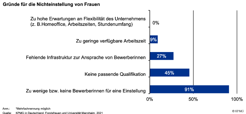 Die Branche hat offensichtlich große Schwierigkeiten, offene Stellen mit Frauen zu besetzen. In der Befragung wurden den Unternehmen fünf Antwortmöglichkeiten vorgegeben, um diesen Umstand zu erklären. Als häufigster Grund dafür, dass nur wenige Frauen bei den Asset Managern anheuern, wurden die zu hohen Anforderungen der Bewerberinnen an die Flexibilität der Arbeitgeber genannt. Frauen fragen zum Beispiel gezielt nach Homeoffice und flexiblen Arbeitszeiten und wollen die Möglichkeit haben, nur in Teilzeit zu arbeiten. Das größte Problem bleibt jedoch das zu geringe Interesse von Frauen an der Branche.