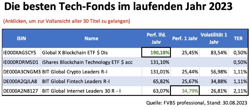 Besser macht es der Global X Blockchain ETF, der gezielt in Unternehmen investiert, die beim Blockchain-Thema ganz vorne mit dabei sind. Der ETF belohnt Anleger, die in den Fonds investiert haben, seit Jahresbeginn mit einem satten Plus von 190 Prozent. Das ist kein Zufall. Auch der iShares Blockchain Technology ETF und der BIT Global Crypto Leaders haben sich dem Crypto-Segment verschrieben. Somit führen drei Blockchain-ETFs die Liste der besten 30 Tech-Fonds in diesem Jahr an – und zwar mit weitem Abstand vor Produkten, die auf das Thema Internet oder allgemein Hightech setzen.