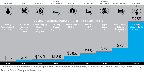 (Geschätzte Volumina der einzelnen Segmente des Weltmarkts für künstliche Intelligenz und Robotics („Finanzen“ gemessen am verwalteten Vermögen), auf Basis von Prognosen für die Jahre 2018 bis 2030 (in Mrd. USD). Quellen: Capital Group und Statista Inc.)