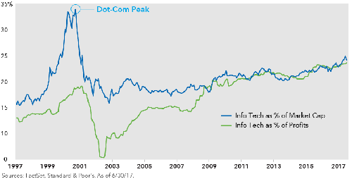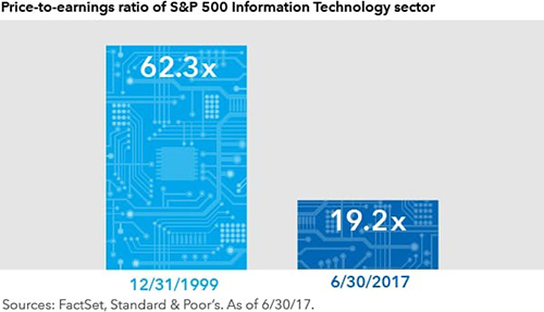 Ein großer Unterschied zur Dotcom-Ära ist, dass Technologieaktien insgesamt heute keineswegs übertrieben teuer sind. Kurz vor der Markteinführung des iPhone 8 notiert Apple zum vierzehnfachen der Konsens- Gewinnerwartungen für die nächsten zwölf Monate. Microsoft und Google notieren zu weniger als dem fünfundzwanzigfachen der erwarteten Gewinne. Natürlich liegen die Bewertungen über denen des Gesamtmarkts. Es gibt aber auch gute Argumente für Gewinnzuwächse, durch die sich die Bewertungen am Ende als gerechtfertigt erweisen.