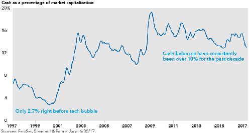 (Barmittel in % der Marktkapitalisierung; Nur 2,7% unmittelbar vor der Technologieblase; Stets über 10% in den letzten zehn Jahren;