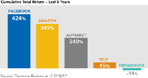 Für kleinere und mittelgroße Internetfirmen wird das Leben damit schwieriger. Ihnen fällt es immer schwerer, mit Google, Facebook und Amazon schrittzuhalten. Kleinere Internetfirmen haben Probleme mit der Kundenloyalität und der Markenbekanntheit, was die direkten Zugriffe auf ihre Webseiten begrenzt. Es fällt ihnen auch schwerer, ähnlich gute Ingenieure für sich zu gewinnen und aufgrund ihrer schwächeren Finanzausstattung haben sie Probleme, ihre Position zu verteidigen. Für die Langfristaussichten dieser Firmen ist das nicht gut. Man könnte meinen, dass für kleine und mittelgroße Internetfirmen ein langfristiger Abwärtstrend begonnen hat.