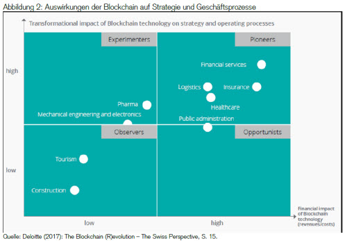 • „Beobachter“ sind Sektoren, in denen die betrieblichen Auswirkungen der Blockchain-Technologien gering sein dürften. Die Implikationen für diese Unternehmen dürften sich daher in Grenzen halten. Es ist eher unwahrscheinlich, dass Mitbewerber hierdurch entscheidende Wettbewerbsvorteile erlangen würden. Die Sektoren Tourismus und Baugewerbe werden als Beispiele angeführt, wobei hier die Baubranche am wenigsten betroffen sein wird.