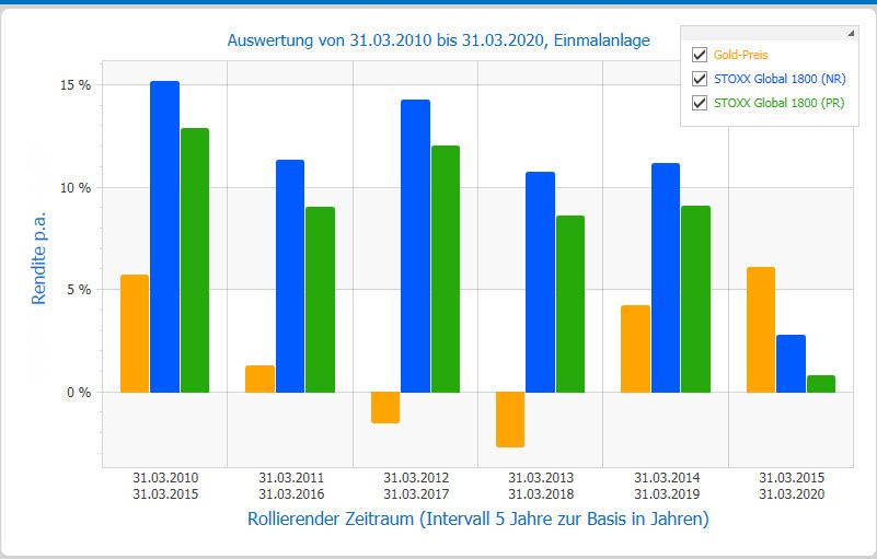 Chart 2: Goldpreis vs. STOXX Global 1800 (NR) vs. STOXX Global 1800 (PR) – Rollierende Wertentwicklung p.a. in Fünf-Jahres-Zeiträumen