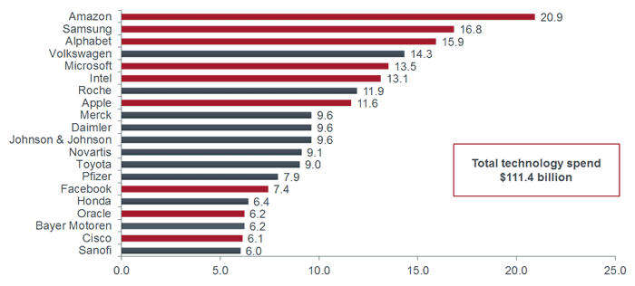 Technology disruption in the automotive space is also resulting in a shift away from traditional car ownership to new, on-demand business models emerging today, such as shared mobility and robo-taxi. Robo-taxis are self-driving/driverless taxis operated for an e-hailing or on-demand mobility service.Will the ownership of autonomous vehicles sit with the robo-taxi type companies or with the individuals/users themselves? In our opinion, the former seems to be more likely in the nearer term, potentially on a five-year horizon. Individual ownership is likely to be a longer-term prospect, once more vehicles are on the market and autonomous vehicle costs have fallen.Digitisation and new business models have revolutionised other industries and the automotive sector will be no exception. We see many potential beneficiaries from the four overarching technological trends discussed here, including the likes of Tesla and Aptiv in the automotive vehicles market and NVidia, Intel, Ambarella, NXP Semiconductors and Infineon, among others, from a component perspective, as well as data and ecosystem players such as Amazon and Google.It is not only the technology providers themselves that are affected by this innovation, other automotive companies have been forced to spend more because of the threat of disruption. As the chart below shows, Honda, Toyota, Daimler and Volkswagen are all significantly increasing their research and development spend in response to the new trends of electric vehicles and, in the longer term, autonomous vehicles.