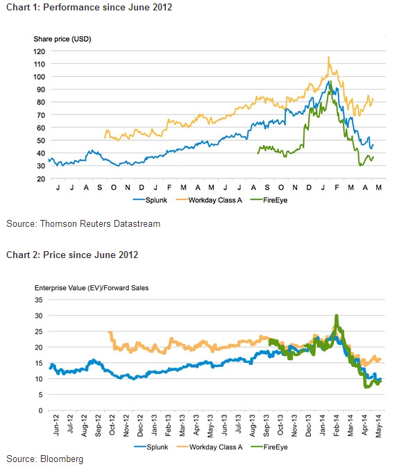 In the halcyon days of 2013, disruptive technology firms pioneering a generational change in information technology (IT) were the place to be. The poster child stocks of Workday, FireEye and Splunk epitomised the fast-moving innovators and investors were happy to pay huge multiples just to own a slice of them (see chart 2). Revenue growth was the only focus; profitability was often seen as a sign of weakness – a reflection of inadequate growth opportunities or spineless management!