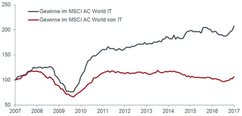 Bei Aufschlüsselung der Gewinne im MSCI AC World Index in Technologie- und sonstige Unternehmen wird deutlich: Technologieaktien sind für den Löwenanteil des Gewinnwachstums im Markt verantwortlich. In den letzten zehn Jahren sind ihre Gewinne um mehr als 108% gestiegen, in den restlichen Branchen dagegen im Schnitt nur um 7%.