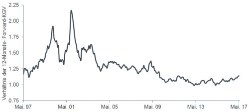 Quelle: Bernstein, Stand: 31. Mai 2017 Anmerkung: Forward-KGV = Forward-Kurs-Gewinnverhältnis. Angegeben sind die Forward-KGVs im MSCI AC World Technology Sector verglichen mit dem MSCI AC World Index. Mai 1997 bis Mai 2017