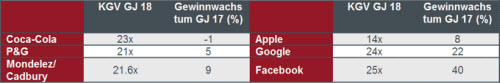 Auf Unternehmensebene wird die Analyse noch aufschlussreicher. Viele Anleger bevorzugen bei Kapitalanlagen so genannte defensive Verbrauchsgüterunternehmen. Deren Vorteile liegen auf der Hand: Unabhängig von der Wirtschaftslage werden Verbraucher auch weiterhin Coca-Cola trinken und Gillette-Rasierer (Proctor & Gamble, P&G) kaufen. Anleger halten diesen Sektor daher für einen sicheren Hafen für ihr Anlagevermögen. Aber die Wachstumsaussichten dieser Firmen liegen häufig weit unter denen vergleichbar bewerteter Technologieunternehmen. Grafik 4 macht das deutlich.
