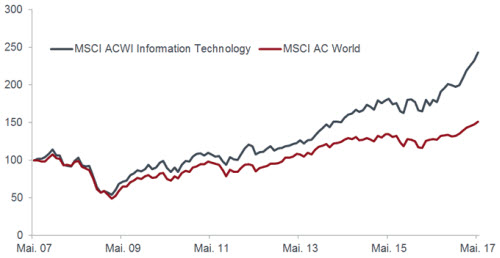 Obwohl Anleger die Technologiebranche als eine von vielen betrachten mögen, ist ihre zentrale Rolle im Rahmen der Transformation der modernen Wirtschaft unbestritten. Ihre Fähigkeit, Gewinne zu generieren, Marktanteile zu gewinnen oder dies nicht traditionellen Firmen zu erleichtern, halten wir für einen strukturellen Vorteil, der allein als Grund schon reicht, eine Anlage in Technologiefirmen für jedes Portfolio in Erwägung zu ziehen.