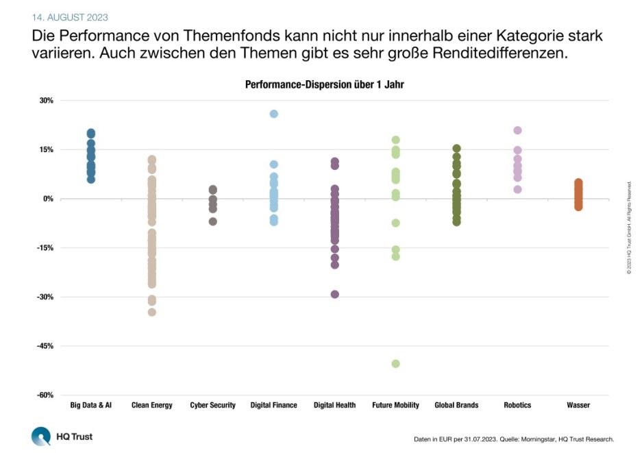 Der Kapitalmarktanalyst und Co-Manager des Multithemenfonds HQT Megatrends untersuchte die Performance von über 200 in Deutschland zugelassenen Publikumsfonds und ETFs, die einen thematischen Ansatz verfolgen und einem für diese Untersuchung relevanten Investmentthema zuzuordnen sind. Bei seiner Auswertung berücksichtigte Jan Tachtler 9 Investmentthemen: Big Data & AI, Clean Energy, Cyber Security, Digital Finance, Digital Health, Future Mobility, Global Brands, Robotics sowie Wasser. Gewertet wurden Fonds oder ETFs, die über den kompletten Betrachtungszeitraum von August 2022 bis Juli 2023 am Markt waren.