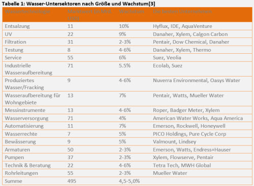 Wie die nachstehende Tabelle zeigt, lässt sich der „Wasser-Anlagemarkt“ in 17 Untersektoren unterteilen. Diese Segmente weisen einen unterschiedlich ausgereiften technologischen Entwicklungsgrad auf und haben daher unterschiedliche Eintrittsbarrieren. Die Segmente im unteren Teil der Tabelle sind bereits erheblich standardisiert und technologisch ausgereift. Das bedeutet Verdrängungswettbewerb bei niedrigen wettbewerbsfähigen Preisen. Die Segmente im oberen Teil der Tabelle bieten eine größere technologische Differenzierung und Innovationen und somit einen geringeren Preiswettbewerb und Mehrwert.