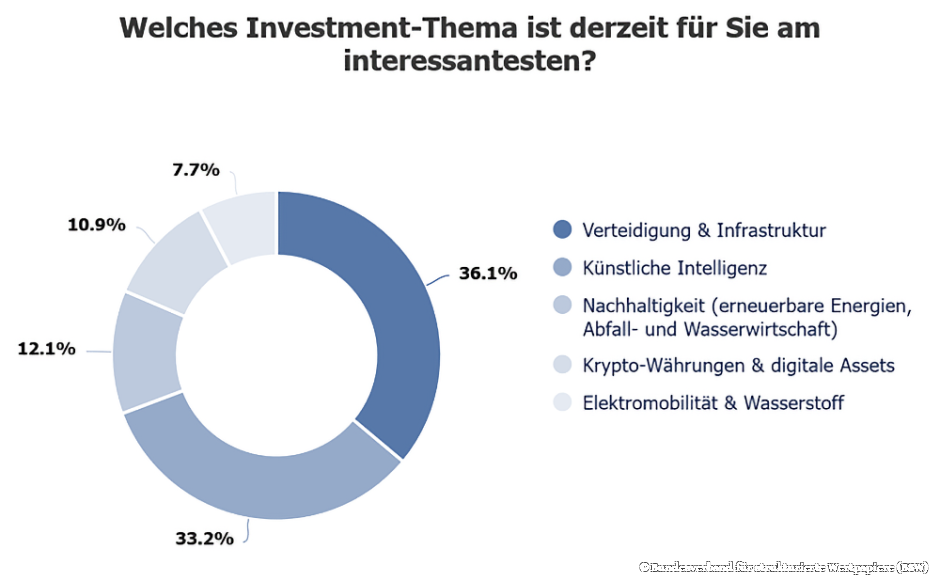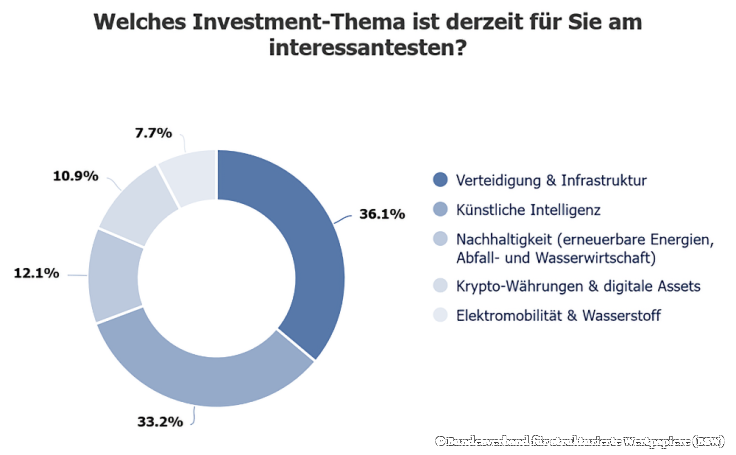 Klar ist: Die Story „Europa muss jetzt schnell aufrüsten“ verkauft sich derzeit gut. Das Interesse der Anleger ist hierzulande besonders hoch. Das bestätigt auch eine aktuelle Umfrage unter deutschen Anlegern (siehe Grafik). Deshalb hält der Hype um die Waffenhersteller an der Börse auch noch an.