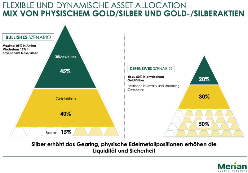Der Merian Gold and Silver Fund rangiert in der Kategorie Aktien. Doch der Fonds ist kein klassischer Minenaktienfonds, sondern ist eher eine Mischung aus Gold-ETF und Minenaktienfonds. Denn das Basisinvestment ist physisches Gold. Fondsmanager Ned Naylor-Leyland kauft über sogenannte Bullion Gefäße Gold, welches physisch einlagert ist. Jedes Gramm, das im Fondsvermögen aufgeführt wird, liegt markiert und unmissverständlich zugeordnet in einem Tresor – eine Besonderheit, die den Fonds von vielen Gold-ETFs unterscheidet. Ergänzt wird das Portfolio mit physischem Silber sowie Gold- und Silberminenaktien. Das Fondsmanagement handelt hier prozyklisch: Steigt der Goldpreis, wird der Anteil von Silber und Aktien im Portfolio erhöht, weil Silber und Minenaktien stärker ausschlagen als Gold und sie so einen natürlichen Hebel darstellen. In defensiven Phasen bleiben Minenaktien und Silber außen vor, und der Anteil des physischen Goldes wird erhöht.
