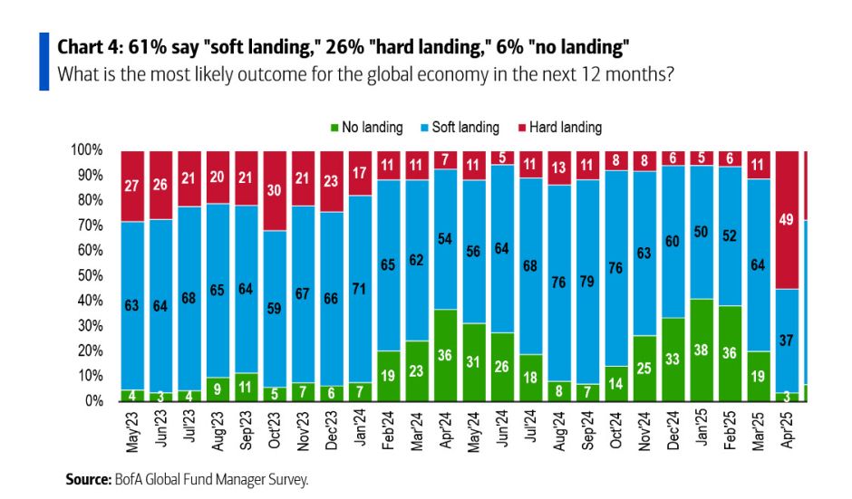 Die Stimmung unter Fondsmanagern hat sich im Mai 2025 gegenüber dem Rekordpessimismus im April etwas aufgehellt, bleibt aber insgesamt negativ. Die Unsicherheit über den Handelskrieg hat sich leicht verringert, was zu einem Rückgang der Rezessions- und Inflationssorgen geführt hat. Ein Netto von 59 Prozent der Befragten erwartet in den kommenden zwölf Monaten eine schwächere Weltwirtschaft – im April waren es noch 82 Prozent (Rekordwert in 30 Jahren Umfragegeschichte). Nur noch 25 Prozent der Befragten rechnen mit einer harten Landung der Wirtschaft (im Vormonat fast 50 Prozent), während 61 Prozent nun ein „Soft Landing“ (allmähliche Abschwächung ohne Rezession) als wahrscheinlichstes Szenario sehen.