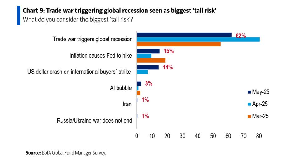 Die Erwartungen an die Inflation sind gesunken: Nur noch netto 30 Prozent erwarten höhere Inflation (April: 57 Prozent). Die Mehrheit rechnet für 2025 mit zwei bis drei Zinssenkungen der US-Notenbank (Fed). Die größten „Tail Risks“ (extreme Risiken) im Mai sind: „Handelskrieg löst globale Rezession aus“ (62 Prozent der Befragten; April: 80 Prozent). Inflation zwingt Fed zu Zinserhöhungen“ (15 Prozent) und US-Dollar-Crash durch Käuferstreik internationaler Investoren“ (14 Prozent).