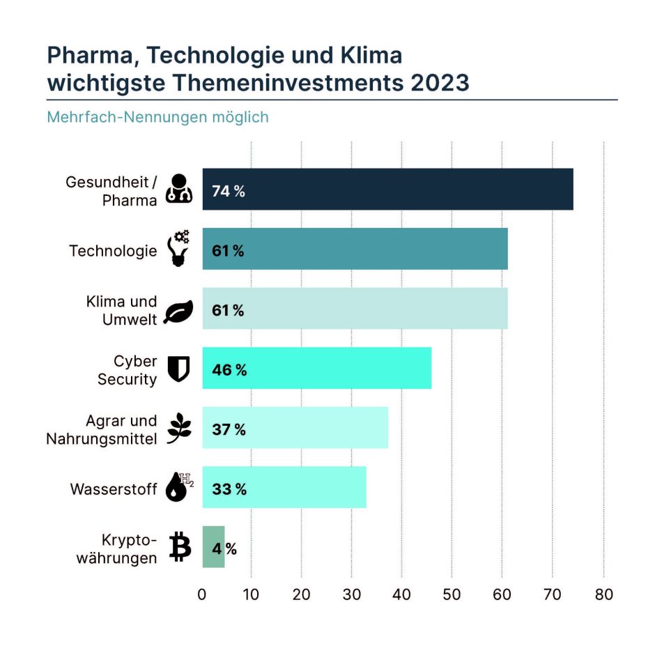 Inflation, steigende Zinsen und die Energiekrise verstärken die Herausforderungen. Aber die Befragten sehen auch große Chancen bei der Entwicklung des DAX, bei Themeninvestments rund um Pharma, Technologie und Klima und der Entwicklung der Schwellenmärkte.