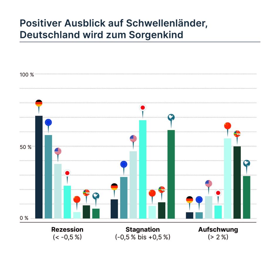 Die Einschätzungen der wirtschaftlichen Entwicklung in Deutschland ist wenig euphorisch. Für viele Umfrageteilnehmer ist ihr Heimatmarkt das Sorgenkind Nr. 1. Hier sehen gut elf Prozent sogar eine Depression mit einem Minus von mehr als zwei Prozent. Zum Vergleich: Für die EU glauben das nur knapp neun Prozent, für die Welt insgesamt nur gut zwei Prozent. Die Hälfte aller Befragten erwartet für die Schwellenländer ohne China im nächsten Jahr einen Aufschwung mit einem Plus von mehr als zwei Prozent, knapp 30 Prozent sogar einen Boom mit mehr als drei Prozent Wirtschaftswachstum.