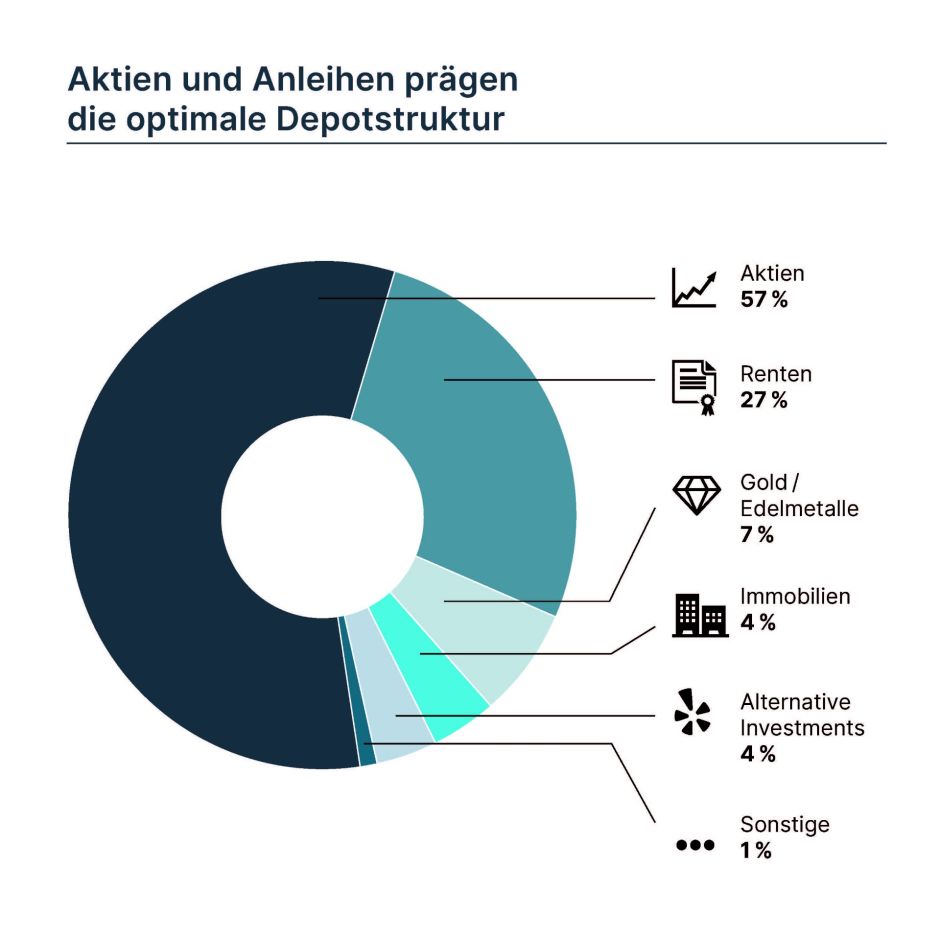 Mit Blick auf die Bedeutung von Aktien herrscht an sich Einigkeit, aber die Gewichtung variiert: „Wir halten 60 Prozent Aktien aus Industrieländern für ein gutes Kerninvestment, das man mit fünf Prozent Aktien aus Schwellenländern anreichern kann“, sagt Thomas Seppi von der FPM Frankfurt Performance Management AG, der damit zu der Gruppe gehört, die den höchsten Aktienanteil empfiehlt. „Nachdem viele Notenbanken die Zinsen erhöht haben, sind auch Anleihen wieder interessant. 20 Prozent reichen aus unserer Sicht aus. Dazu zehn Prozent Immobilien und fünf Prozent Gold oder andere Edelmetalle – und fertig ist das Portfolio.“