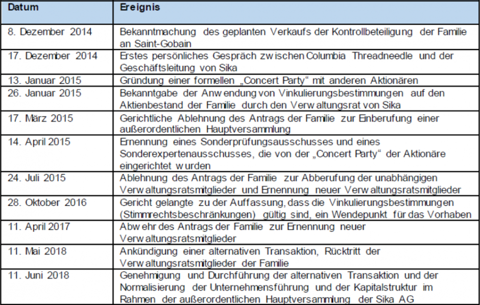 Die Geschichte begann am 5. Dezember 2014, als Saint-Gobain Sika seine Absicht mitteilte, die im Besitz der Familie Burkard, Nachkommen des Gründers Kaspar Winkler, befindlichen Aktien von Sika für 2,75 Mrd. CHF zu kaufen.