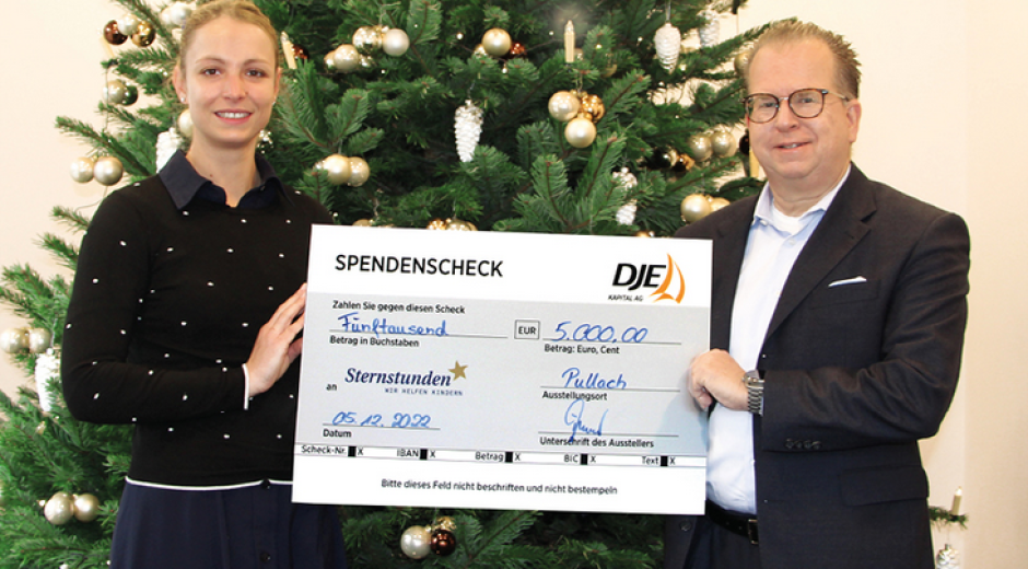 Am 5. Dezember überreichte Thorsten Schrieber Anne Kostanda von Sternstunden den symbolischen Scheck in Höhe von 5.000 Euro im Namen von DJE. Die Unterstützung der Sternstunden ist für ihn eine Herzenssache: „Wir freuen uns, mit Sternstunden als erfahrener Spendenorganisation erneut in Not geratene Kinder unterstützen zu können. Sie sind die schwächsten Mitglieder der Gesellschaft und zugleich unsere Zukunft. Mit unserer Spende wollen wir unseren Teil dazu beitragen, ihre Lage, ihre medizinische Versorgung oder ihre Zukunftsaussichten möglichst nachhaltig zu verbessern.“
