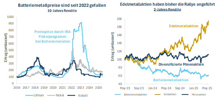 Ein Grund für die niedrigen Bewertungen sind die unter Druck geratenen Notierungen insbesondere der Batterierohstoffe. So sind die Lithiumpreise seit ihrem Höchststand im Jahr 2023 um 87,7 Prozent gefallen, während die Nickel- und Kobaltpreise seit ihrem Höchststand im Jahr 2022 um 67,2 Prozent bzw. 55,9 Prozent gesunken sind. Während dieses volatilen Zeitraums wichen die Ergebnisse der Minenaktien stark voneinander ab. Die Aktienkurse von Bergbauunternehmen im Bereich der Batteriemetalle haben sich in den letzten zwei Jahren fast halbiert, während sie sich im Bereich der Edelmetalle in diesem Zeitraum fast verdoppelt haben, während die Performance der diversifizierten Minenunternehmen im Wesentlichen gleich geblieben ist.