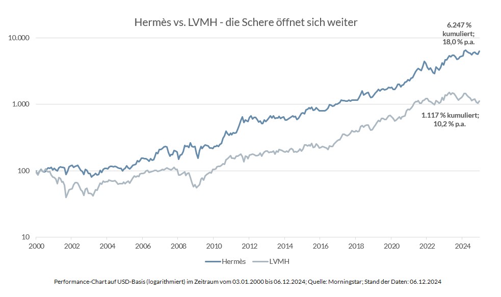 Auf Unternehmensebene erzielte Hermès im dritten Quartal ein zweistelliges (!!!) organisches Wachstum (oW) von 11,3 % auf 3,7 Mrd. Euro Umsatz, während LVMH im selben Zeitraum geschrumpft ist und Kering (z. B. Gucci) erneut Umsatz- und Gewinnwarnungen veröffentlichen musste.