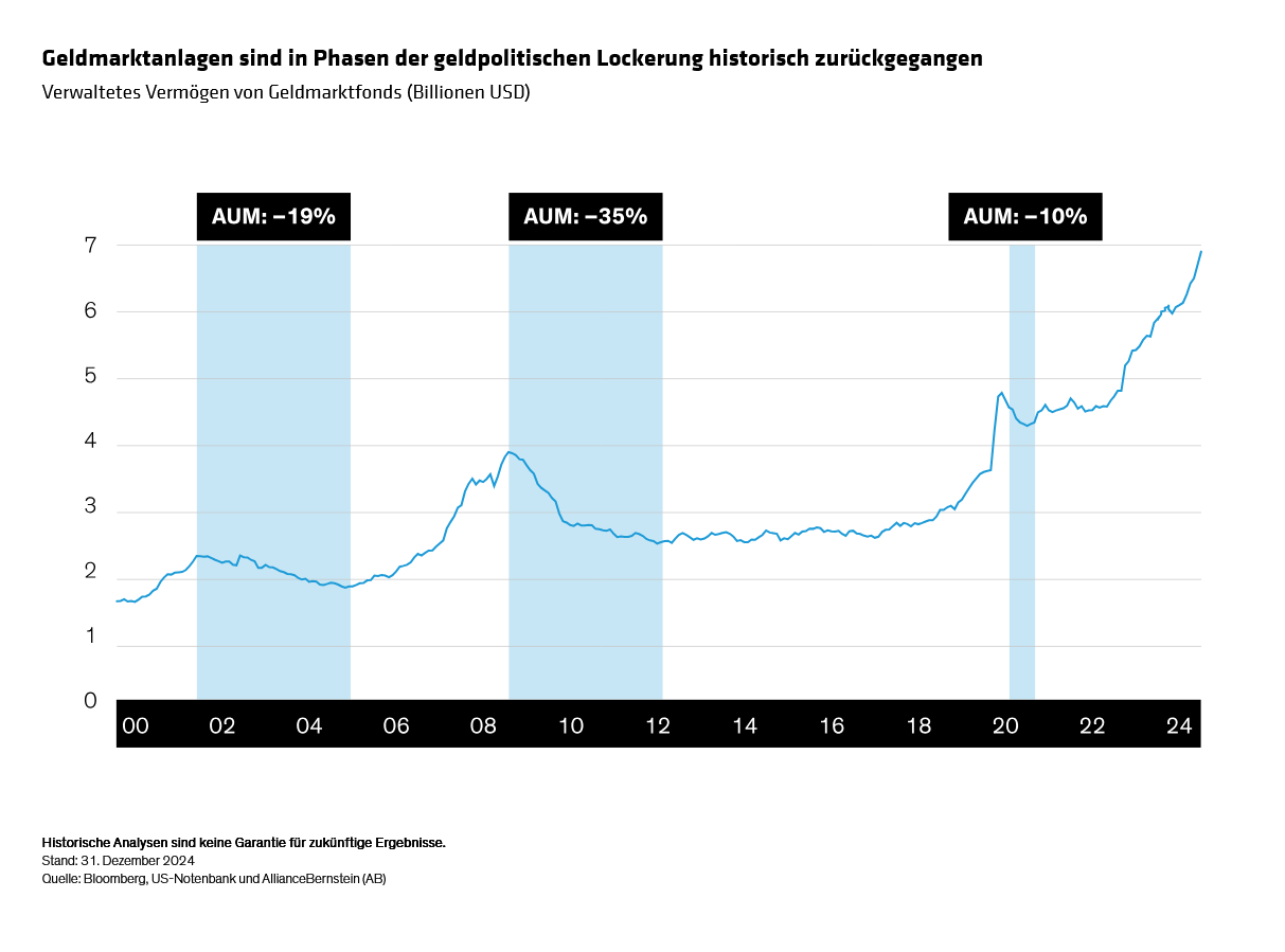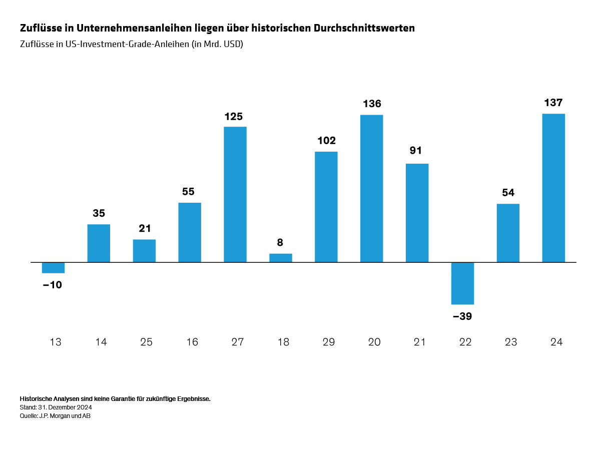 In Europa verlangsamten sich die Zuflüsse in Investment-Grade-Anleihen Ende 2024, lagen aber immer noch deutlich über dem Niveau von 2023. In den USA schlossen die Zuflüsse in Investment-Grade-Anleihen das Jahr 2024 auf dem höchsten Stand seit 2020 ab (siehe Abbildung) – obwohl immer noch fast 7 Billionen US-Dollar in Geldmarktfonds geparkt sind.