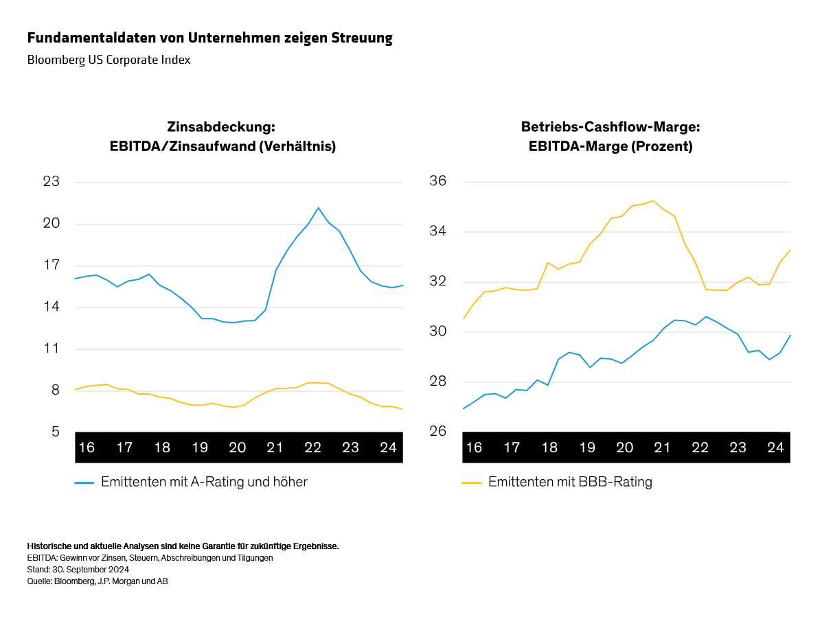 Die Fundamentaldaten von Unternehmen sind sowohl bei Hochzinsanleihen als auch bei Investment-Grade-Unternehmensanleihen im Allgemeinen weiterhin stark, aber die Streuung hat sich über Sektoren und Bonitätsbewertungen hinweg vergrößert.