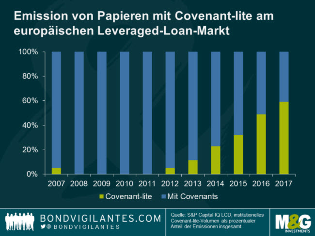Seitdem, insbesondere über die letzten fünf Jahre hinweg, reduzierte sich das Maintenance-Covenants-Paket insofern, dass es zuerst nur noch den Verschuldungsgrad beinhaltete. Mittlerweile ist „Cov-lite“ ein gängiger Begriff zur Beschreibung von Darlehensgeschäften komplett ohne Maintenance Covenants (Incurrence Covenants sind wohlgemerkt nach wie vor existent). Wie unten ersichtlich steigt der Anteil an Leveraged-Loan-Transaktionen, die als Cov-lite ausgestaltet sind, beständig an.