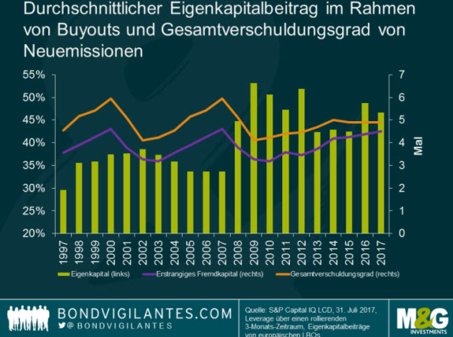 Aber es gibt auch einige positivere Trends. Die durchschnittliche Fremdkapitalfinanzierung von Transaktionen mit Leveraged Loans liegt immer noch unterhalb der Spitzenstände von vor der Krise und dürfte sich den Erwartungen nach auf dem derzeitigen Niveau stabilisieren. Darüber hinaus liegt der Eigenkapitalbeitrag im Rahmen von Buyouts aktuell näher an der Marke von 50% (und steigend), anstatt den circa 40%, die man in den Jahren von 2013 bis 2015 beobachten konnte. Diese Aspekte nehmen positiven Einfluss auf die Realisierungsquoten und könnten dem Kommentar oben womöglich entgegenwirken.