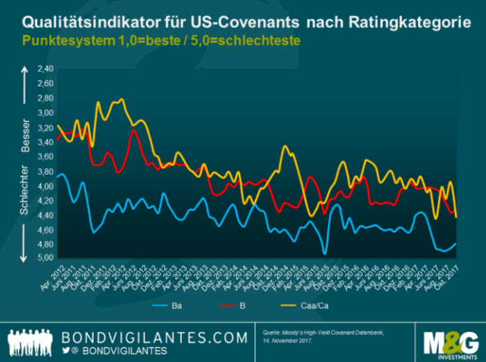 Ein vor kurzem von Moody‘s veröffentlichter Bericht bestätigt, dass Anleihenemittenten und Berater bei der Emission von Anleihen Rückendeckung haben, da die Nachfrage nach höher rentierlichen Vermögenswerten nach wie vor hoch ist. Der North American Covenant Quality Indikator, der den rollierenden Durchschnitt über drei Monate zugrunde legt, weist die zweitschlechteste Schutzqualität für sämtliche Bonitätskategorien seit 2011 auf. Nur im August 2015 gab es noch schlechtere Werte.