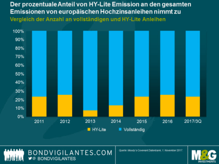 Seit 2013 hat sich der Anteil sogenannter „HY-lite“-Anleihen laut Moody‘s deutlich erhöht. Gemessen als prozentualer Anteil aller Emissionen pro Jahr nehmen die HY-lite-Emissionen seit 2013 zu – von einem Niveau deutlich unter 10% auf ein Drittel aller emittierten Anleihen. Absolut gesehen haben Anleger in den ersten drei Quartalen 2017 mehr neu aufgelegte europäische Hochzinsanleihen mit erheblich lockereren Vertragsklauseln gesehen als in den Gesamtjahren 2015 und 2016.