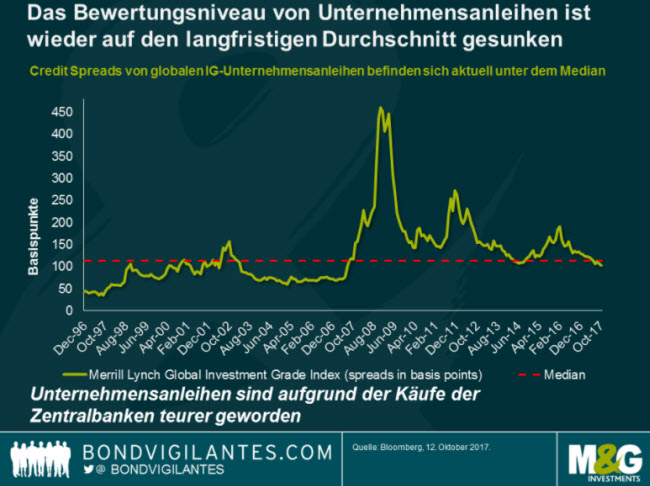 Würde man sich einfach das Spread-Niveau des gesamten globalen Investment-Grade-Universums anschauen, wäre man beruhigt, da die Bewertungen trotz der Rally bei den Preisen für Unternehmensanleihen in den letzten Jahren (und vor allem nach der Entscheidung der EZB, Unternehmensanleihen in das Kaufprogramm für Wertpapiere aufzunehmen) schlichtweg auf ihren langfristigen Durchschnitt zurückgegangen sind.