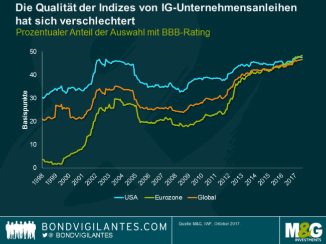 Leider hat sich das Universum für globale Investment-Grade-Anleihen seit der Finanzkrise dramatisch verändert, und zwar in einem Ausmaß, das diesen langfristigen Durchschnitt beinahe bedeutungslos werden lässt. Die Qualität von Investment-Grade-Unternehmensanleihen hat sich in den letzten Jahren erheblich verschlechtert. Teilweise geschah das freiwillig, da Unternehmen der Überzeugung sind, dass sie durch eine höhere Fremdkapitalquote in den Bilanzen die Erträge steigern können (ebenso wie durch das Ausnutzen des sogenannten „Tax Shield“ bei der Abzugsfähigkeit der Zinsen), es reflektiert aber auch die weitverbreiteten Rating-Herabstufungen, die Banken und Finanzinstitutionen während und nach der Kreditkrise hinnehmen mussten. Beispielsweise verfügte die Barclays Bank im Jahr 2007 über das Emittentenrating Aa2 von Moody‘s, heute hat die Bank ein Baa2-Rating. Mit Blick auf den Gesamtmarkt beinhaltete der gerade entstehende Kreditmarkt der Eurozone Wertpapiere mit BBB-Rating in Höhe von weniger als 10%, beim US-Kreditmarkt waren es etwas mehr als 30%.
