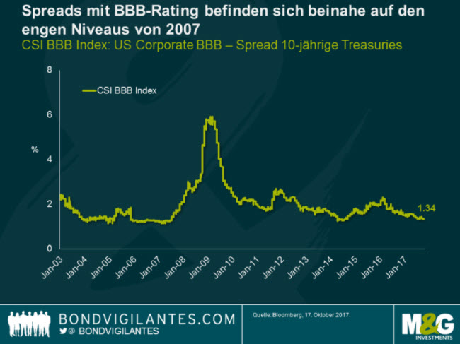 Schaut man sich den globalen BBB Credit Index Spread an, wird deutlich, dass wir mit 134 Basispunkten in der Nähe des niedrigen Spreads von 120 Basispunkten liegen, den man 2007 beobachten konnte (dem extremen Jahr der Blasenbildung vor der großen Finanzkrise) und dass wir damit weit unter dem durchschnittlichen Spread von 200 Basispunkten liegen, den Vermögenswerte mit BBB-Rating seit 2002 abwarfen.
