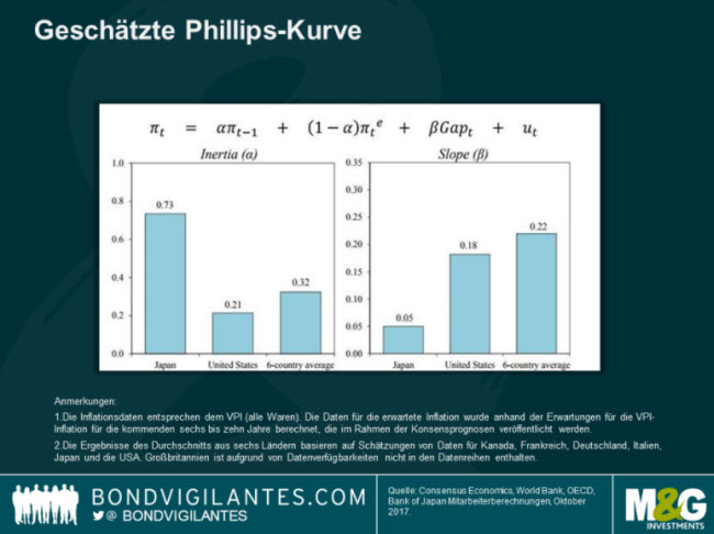 Der stellvertretende Gouverneur der Bank of Japan, Hiroshi Nakaso, war vor einigen Wochen in London und brachte eine optimistische Beurteilung des potenziellen Wachstums der japanischen Wirtschaft mit. Seine Aufzeichnungen können hier eingesehen werden. Die Rede suggerierte scheinbar, dass von den „Drei Pfeilen“ Abes (Fiskalpolitik, Geldpolitik und Strukturreformen) lediglich der letzte Pfeil, also die Strukturreformen, tatsächlich Auswirkungen auf die Wachstumsaussichten für Japan haben würden. Nakaso war vor allem zuversichtlich was den Ausblick für das Wachstum der Erwerbsbevölkerung der älteren und nicht japanischen Arbeitnehmer angeht (die Erwerbsquote der Frauen in Japan liegt mittlerweile über der in Großbritannien und den USA). Mit Blick auf die Geldpolitik fand ich die Grafik weiter unten interessant. Sie zeigt eine Aufteilung der Bank of Japan von Japans Phillips-Kurve im Vergleich zu anderen Nationen. Erstens sollte man darauf hinweisen, dass Japans Phillips-Kurve VIEL flacher ist als die in den USA und in anderen Ländern (rechte Grafik). Die Arbeitslosenquote in Japan sank von 5,5% auf 2,9%, praktisch ohne Lohnzuwächse. Aber zweitens sollten wir uns aufgrund der Grafik auf der linken Seite Sorgen machen. Die „Trägheit“ zeigt, dass die niedrige Inflation in Japan größtenteils von der Tatsache getrieben wird, dass die Inflation in vorherigen Zeiträumen niedrig ausfiel. Anders gesagt ist die Erwartungskomponente der Phillips-Kurve in Japan wesentlich wichtiger als in den USA oder anderswo und zeigt, wie wichtig es ist, dass a) Japan die psychologische Mentalität von stagnierenden Preisen durchbricht (durch Lohnpolitik? Durch Zinsanhebungen, um eine Erholung der Wirtschaft zu suggerieren?) und b) dass westliche Zentralbanken es nicht zulassen, dass sich auch hier eine Deflationsmentalität entwickelt.