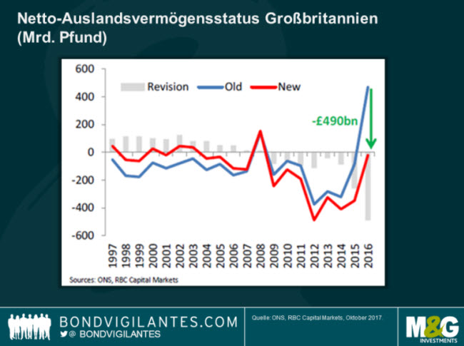 Der Daily Telegraph veröffentlichte gestern diesen Artikel, der nahelegt, dass Großbritannien fast eine halbe Billion Pfund „ärmer ist als bisher angenommen“. Dank der Revisionen des britischen Statistikamtes (Office for National Statistics) ist aus einer deutlich positiven Position des Nettovermögens im Ausland ein Defizit von 21 Mrd. Pfund geworden. Anders gesagt ist das Gesamtvolumen britischer Investitionen im Ausland weniger wert als ausländische Investitionen in Großbritannien. Die unten aufgeführte Grafik von RBC zeigt den Umfang dieser Korrektur, sie zeigt aber auch, dass die Investitionen Großbritanniens im Ausland im letzten Jahr sprunghaft angestiegen sind. Dieser Anstieg basiert auf dem Absturz des Pfund nach der Brexit-Abstimmung, wodurch der Wert des Auslandsvermögens Großbritanniens in Pfund höher erscheint. Peter Schaffrik von RBC sagte, „die Revision der Ergebnisse von 2016 erschafft kein neues Problem, sie dient als Erinnerung, den Fokus wieder auf das bestehende zu richten“. Da unser Auslandsvermögensstatus ein Defizit aufweist, wird es schwer, ausreichend Nettoauslandserträge zu generieren, um die Höhe des umfangreichen Leistungsbilanzdefizits Großbritanniens zu reduzieren. Braucht es eine weitere Abwertung des britischen Pfund?