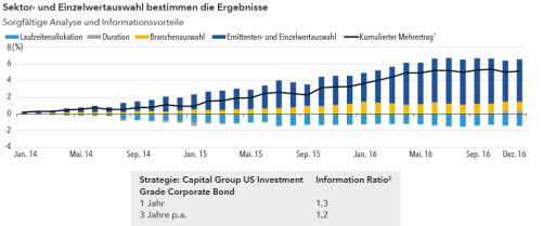 Um mit US-Unternehmensanleihen stetigen Mehrertrag zu erzielen, muss man aus unserer Sicht alle Faktoren analysieren, die den Marktertrag beeinflussen können. Dazu zählen einzelwertspezifische Fundamentaldaten, die Konjunktur und langfristige Trends. Eine sorgfältige Analyse all dessen kann helfen, vielfältige Chancen zu entdecken, die unabhängig vom Kreditzyklus Mehrertrag versprechen.Wer Potenziale nutzen will, darf die Emittentenauswahl nicht vernachlässigen. Die besten aktiven Manager sind die, die Unternehmen mit hohem Mehrertragspotenzial finden können – und, ebenso wichtig, Titel meiden, denen eine Herabstufung oder eine Verschlechterung der Kreditqualität droht.Wir glauben, dass unser Einzelwertansatz maßgeblich zu den hohen risikoadjustierten Erträgen unserer US-Corporate-Bond-Strategie (USCB) beigetragen hat, wie die Abbildung unten zeigt. Umso wichtiger ist es, dass wir unser eigenes Unternehmensanleihenresearch weiter stärken.