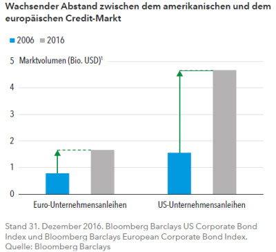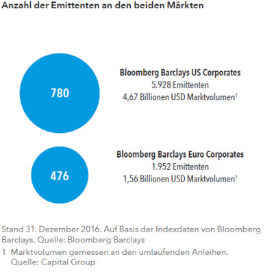 Weil die amerikanischen Kapitalmärkte wesentlich tiefer und liquider sind als die europäischen (vgl. die beiden Abbildungen auf der nächsten Seite), können Portfoliomanager hier leichter diversifizierte, stabile und zugleich flexible Portfolios zusammenstellen. Sie können leichter Titel meiden, deren Kreditqualität nachlässt. Europäische Unternehmen setzen hingegen traditionell mehr auf Bankkredite, sodass sich der Euro-Markt weniger gut entwickelt hat.