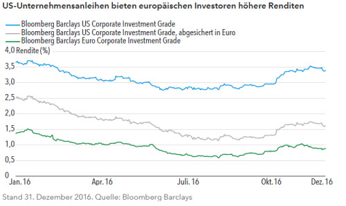 US-Unternehmensanleihen bieten Mehrertrag gegenüber Geldmarktanlagen und Staatsanleihen. Dies führt zu höheren laufenden Erträgen bei einer guten Kreditqualität. Die Renditen sind auch höher als die vergleichbarer Papiere aus Europa, wo die lockere Geldpolitik der Europäischen Zentralbank für dauerhaft niedrige Zinsen gesorgt hat. Selbst wenn man die Anleihen in Euro absichert, bleiben die Renditen höher – wie die folgende Abbildung zeigt.