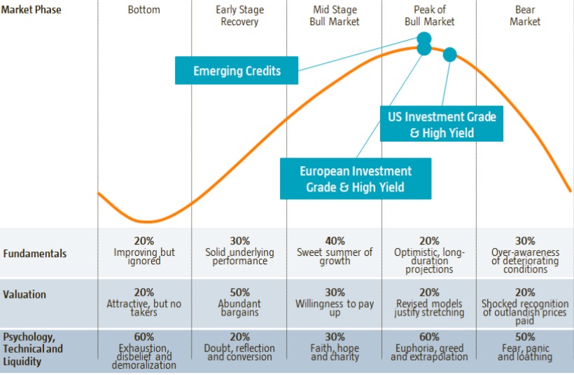 Mehrere Indikatoren weisen darauf hin, dass der Kreditzyklus seinem Höhepunkt entgegengeht. Es ist schwierig, den Wendepunkt genau vorherzusagen. Märkte können eine ganze Weile auf einem „Hochplateau” verweilen. Nach unserer Einschätzung gehen die US-Märkte voran und haben den Gipfelpunkt des Bullenmarktes bereits hinter sich.