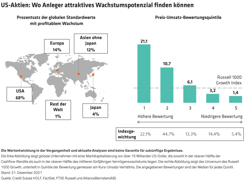 Auch wenn die nächsten Jahre sicherlich nicht so aussehen werden wie die letzten, sind wir der Meinung, dass Anleger angesichts der Konzentration profitabler Wachstumsunternehmen in den USA weiterhin am US-Aktienmarkt engagiert bleiben sollten. Allerdings ist es unter den heutigen, sich schnell verändernden Marktbedingungen strategisch notwendig, die Preisdisziplin aufrechtzuerhalten, indem man die am meisten überteuerten Wachstumswerte meidet und Portfolios mit Unternehmen mit solider Profitabilität und Wachstumspotenzial aufbaut.