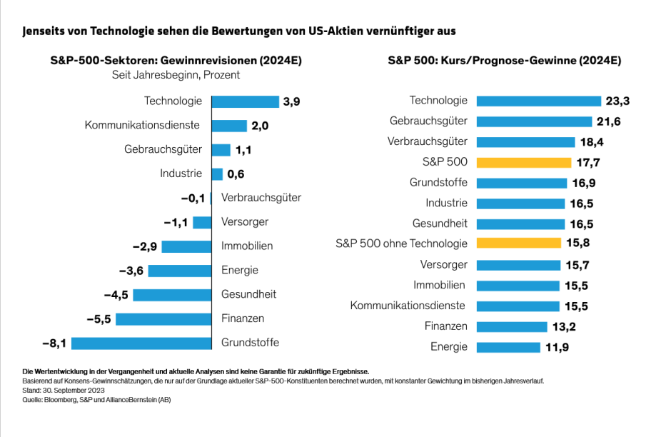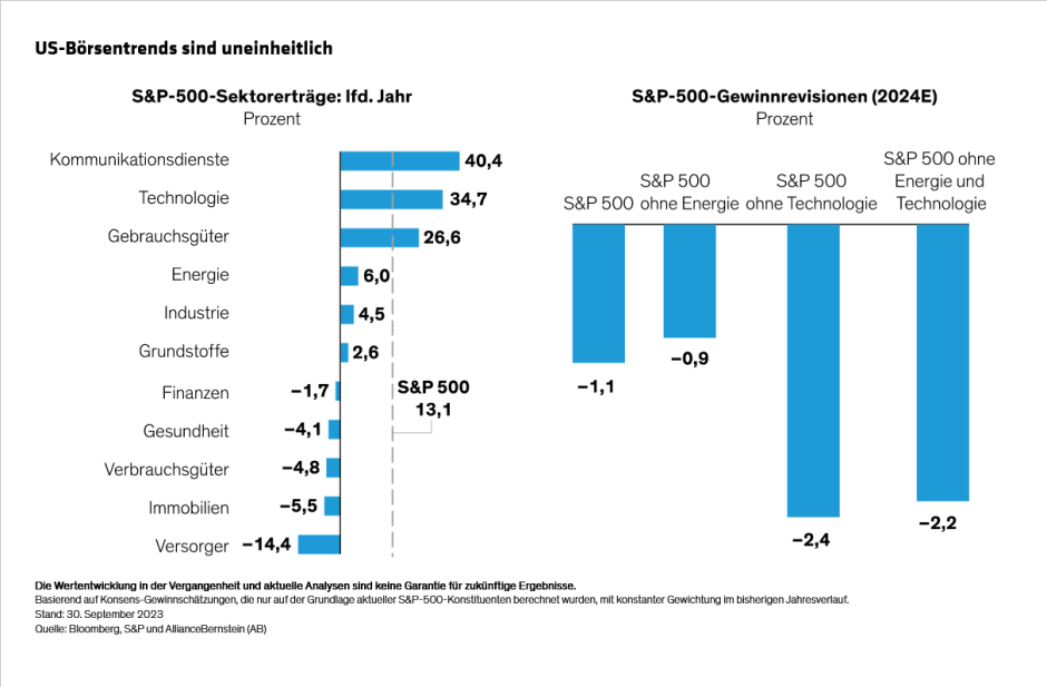 Trotz der Schwäche im dritten Quartal, in dem der S&P 500 einen negativen Ertrag von 3,3 % erzielte, zeigte sich der Markt erstaunlich widerstandsfähig. Unter der Oberfläche war die Wertentwicklung jedoch uneinheitlich (Abbildung). Technologie- und Verbrauchertitel haben die Gewinne angeführt, angetrieben von einer kleinen Gruppe von Unternehmen, die als große Gewinner der Künstlichen Intelligenz (KI) gelten. Ohne den Technologiebereich sind die Gewinnrevisionen für den Markt um 2,2 % gesunken, was auf eine Schwäche im Großteil des restlichen Marktes hindeutet.